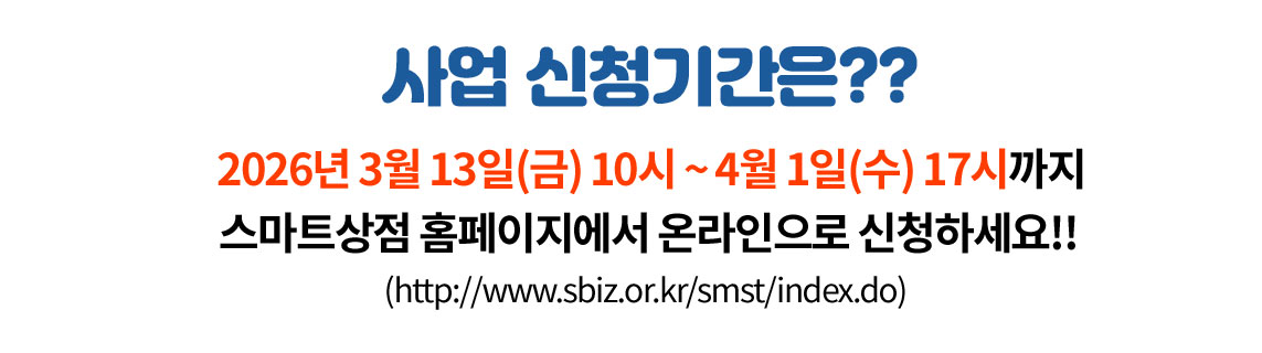 ¡à »ç¾÷ °³¿ä o (»ç¾÷¸í) 2026³â ½º¸¶Æ®»óÁ¡ ±â¼úº¸±Þ»ç¾÷ ½Åû (±¸ÀÔÇü¡¤·»Å»Çü¡¤S/WÇü) o (Áö¿ø´ë»ó) 「¼Ò»ó°øÀα⺻¹ý」 Á¦2Á¶¿¡ µû¸¥ ¼Ò»ó°øÀÎ*À¸·Î, ½ÅûÀÏ ÇöÀç Á¤»óÀûÀ¸·Î ¿µ¾÷ ÁßÀÎ Á¡Æ÷ * Áß¼Ò±â¾÷ÇöȲÁ¤º¸½Ã½ºÅÛ( sminfo.mss.go.kr )¿¡¼ ¼Ò»ó°øÀÎÈ®Àμ ¹ß±Þ °¡´ÉÇÑ Á¡Æ÷